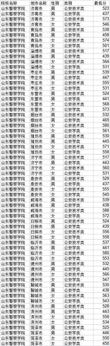 如上表所示,以山东警察学院为例,2022年该校公安学类专业进入面试体检的分数线:烟台为男生465分,泰安为男生437分,相差28分。因此可以看出同一专业在面向不同地区招生时的分数也有所差别。